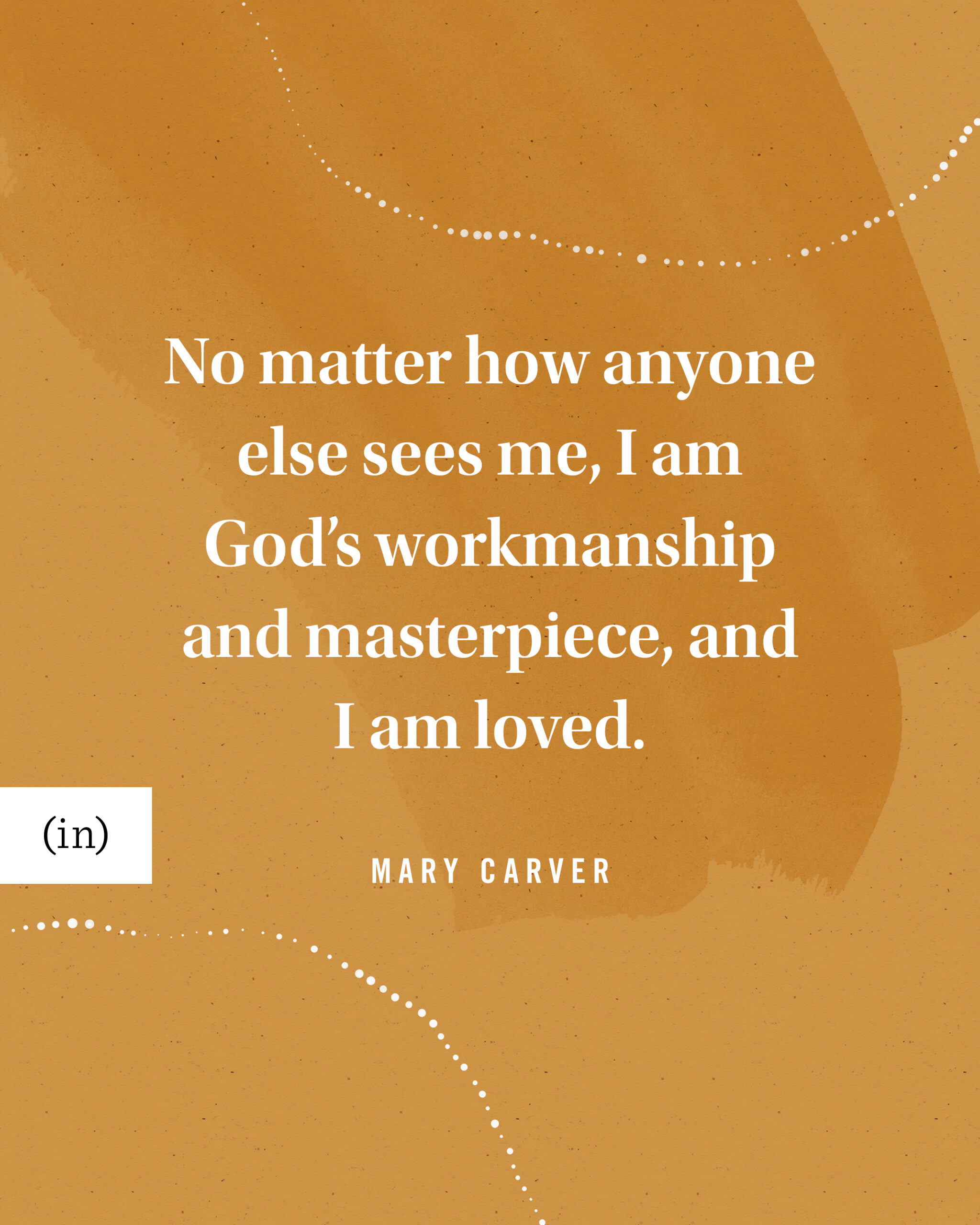 Thank You, Lord, for being a safe place where I am called good, where I take up just the right amount of space, where I am seen and loved and welcome to be who I am, how I am, just as I am. Even saying that calms my heart and lets me breathe deeper. Give me the strength to truly recognize that no matter how anyone else sees me, I am God’s workmanship and masterpiece, and I am loved. Amen.